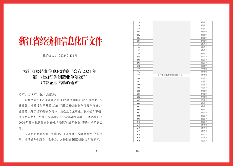 近日,浙江省經(jīng)濟(jì)和信息化廳公布了2024年第一批浙江省制造業(yè)單項(xiàng)冠軍培育企業(yè)名單,浙江申發(fā)軸瓦股份有限公司憑借卓越的研發(fā)創(chuàng)新實(shí)力和行業(yè)領(lǐng)先地位,成功入選該名單。